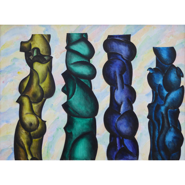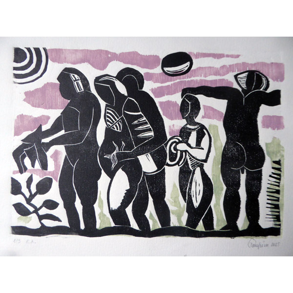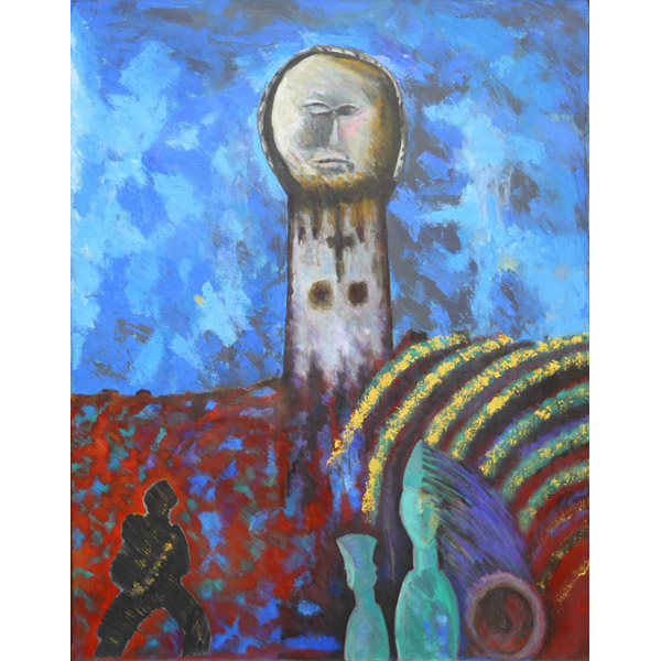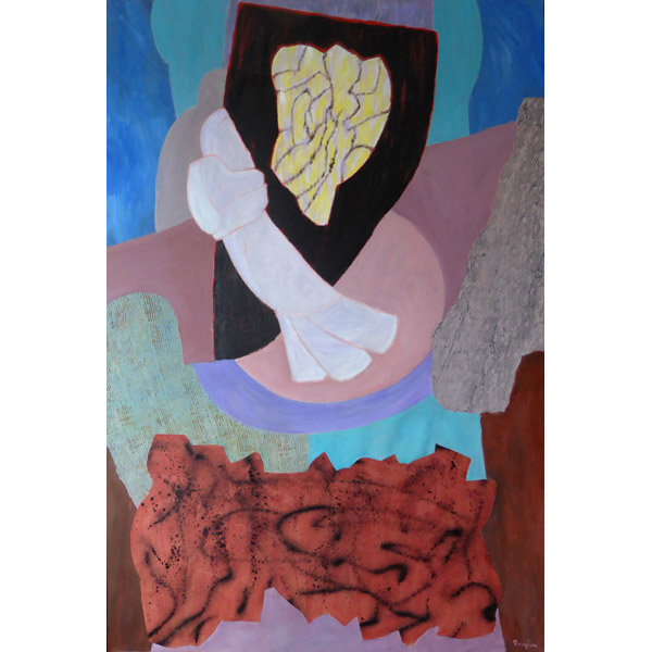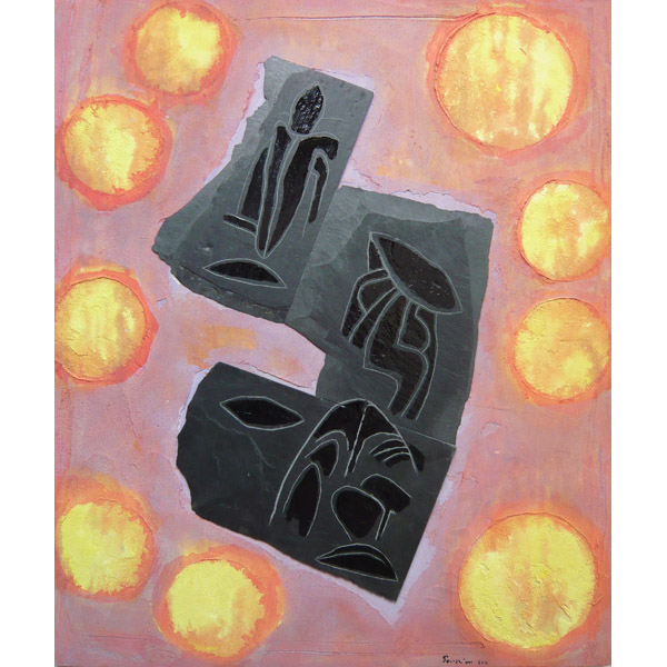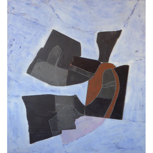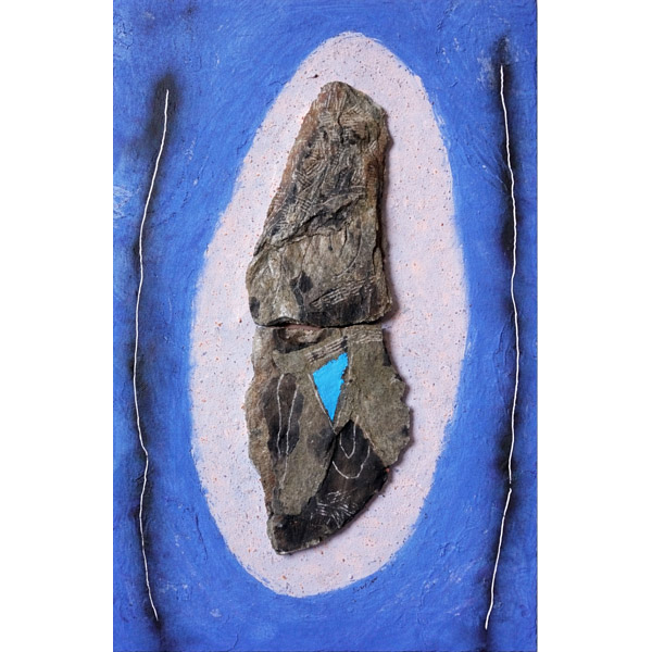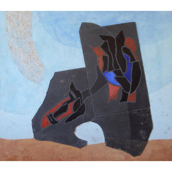 J’ai souvent travaillé par série : Métamorphose de la charmille en 1976 ; les totemfem en 1980 ; puis les icônes, formes peintes puis réécrites par l’empreinte de peinture jetée (dripping) réalisant leur propre autonomie ; les immigrés pendant 5 ans ; les stèles et signes issue des mégalithes et porteurs de symbole, de spiritualité et de puissance intérieure ; les ardoises depuis 30 ans, gravées, peintes, découpées, fixées sur des fonds de matières diverses, répercutent un archétype originel de l’homme, soit par signes, dessins, formes des civilisations premières, avec l’empreinte du temps par la dégradation, la faillibilité de l’homme évoquée par la fragilité du support et plus récemment, les moments de Syrie ; la mémoire du monde du travail.
